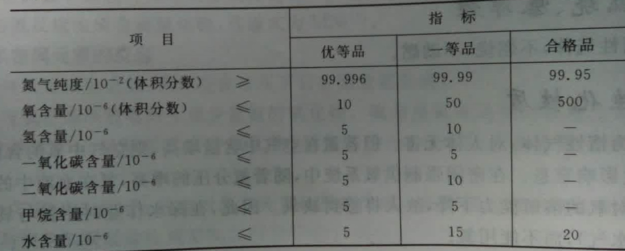 產品生產方法很多,工藝及設備差異很大,產品質量相當懸殊;另外,使用要求也很大不同。國內高純氮規定了三個等級,以適應不同應用的需要,具體分級的技術指標如表