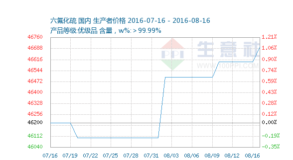 8月16日六氟化硫出廠報價在48000元/噸,實際成交價格靈活,六氟化硫裝置正常開車,庫存適中,貿易商交投尚可。
